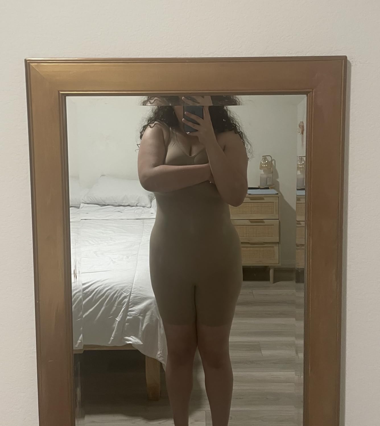 Light-weight, stretchy and skin-friendly,Breast area and the bottom area are made of breathable mesh material, easy and comfortable for all-day long-wearing.Wide straps and no compression bra design fit for all cupshelp tighten your bottom and lift your buttockOpen gusset easier to go to the bathroomThe thigh compression design ensures this mid-thigh slimmer will not roll down or up.